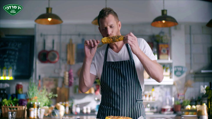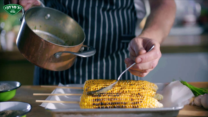 - משפדים קלחי תירס על שיפוד עץ, מתבלים במלח ופלפל, מורחים את הקלחי תירס בחמאה וצולים על רשת על הגז או במחבת גריל או על האש במנגל