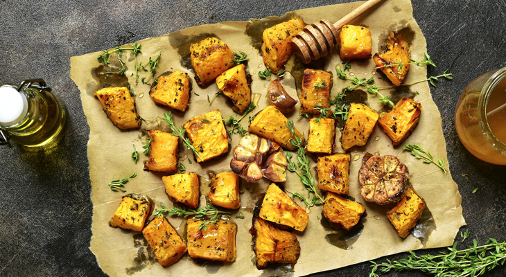 מנת ביניים: דלעת בתנור עם בצל ירוק וויניגרט צ'ילי-דבש