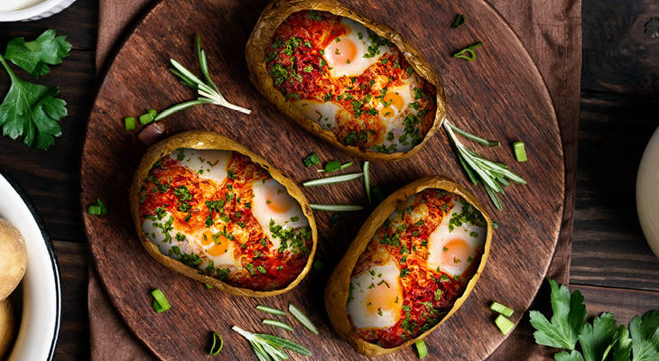 ממלאים את סירות תפוחי האדמה במחית המתובלת, שוברים מעל ביצים, מתבלים במעט מלח ומטפטפים שמן זית.